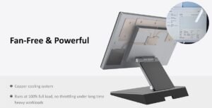 Echipat cu un sistem de răcire avansat fără ventilator, bazat pe conductivitate termică din cupru, terminalul POS oferă performanță stabilă și silențioasă, chiar și în condiții de sarcini intense și prelungite. Funcționează la 100% din capacitate fără reducerea frecvenței (fără throttling), fiind soluția ideală pentru afaceri care necesită fiabilitate 24/7 în medii cu trafic ridicat.